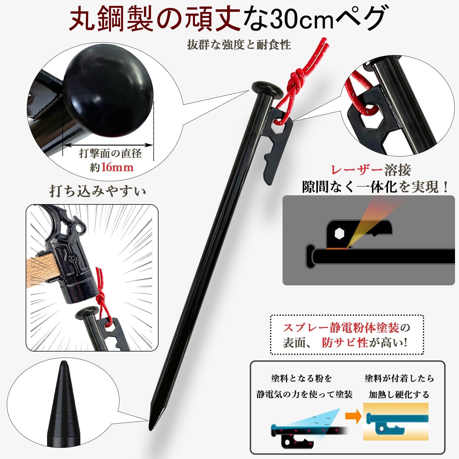 【ペグ材質】丸鋼 (抜群な強度と耐食性、サビにくい) 【サイズ】長さ約30cm、直径約10mm 【重さ】約185g/本 【セット内容】ペグと収納ケースと自在金具