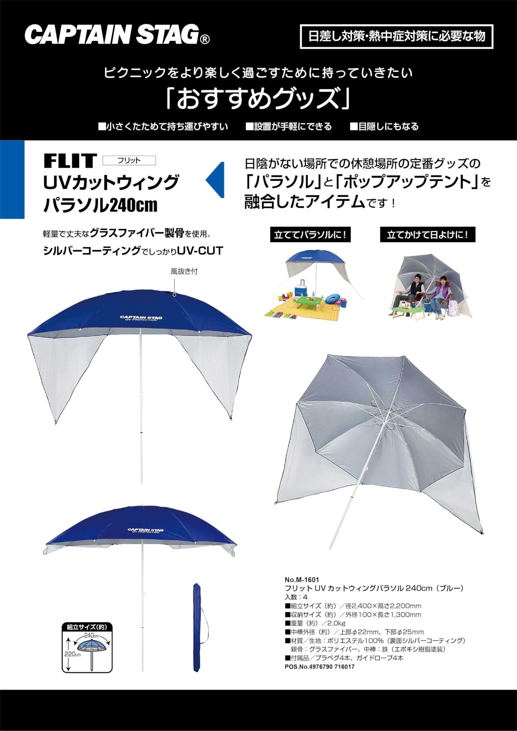 キャプテンスタッグ BBQ 海用 パラソル UVカット ウイング240cm ブルーM-1601