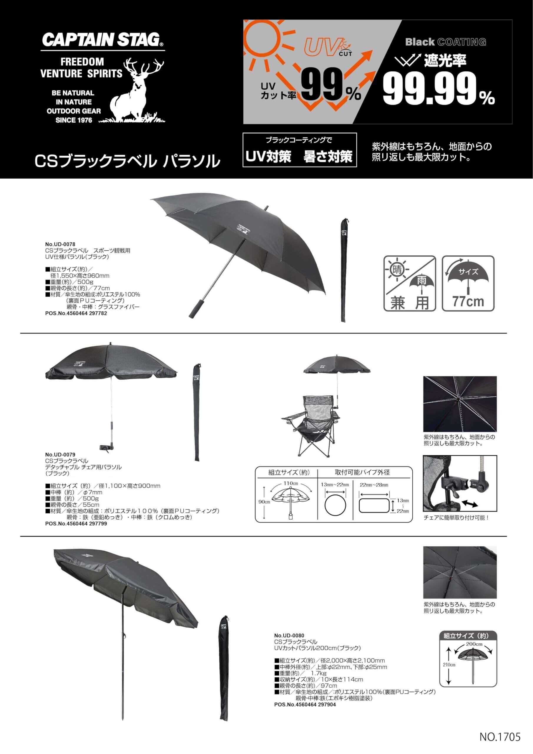キャプテンスタッグ(CAPTAIN STAG) パラソル 傘 日傘 日除け UVカット デタッチャブル チェア用パラソル スポーツ観戦用 収納バッグ付き ブラック CSブラックラベル UD-78/UD-79/UD-80