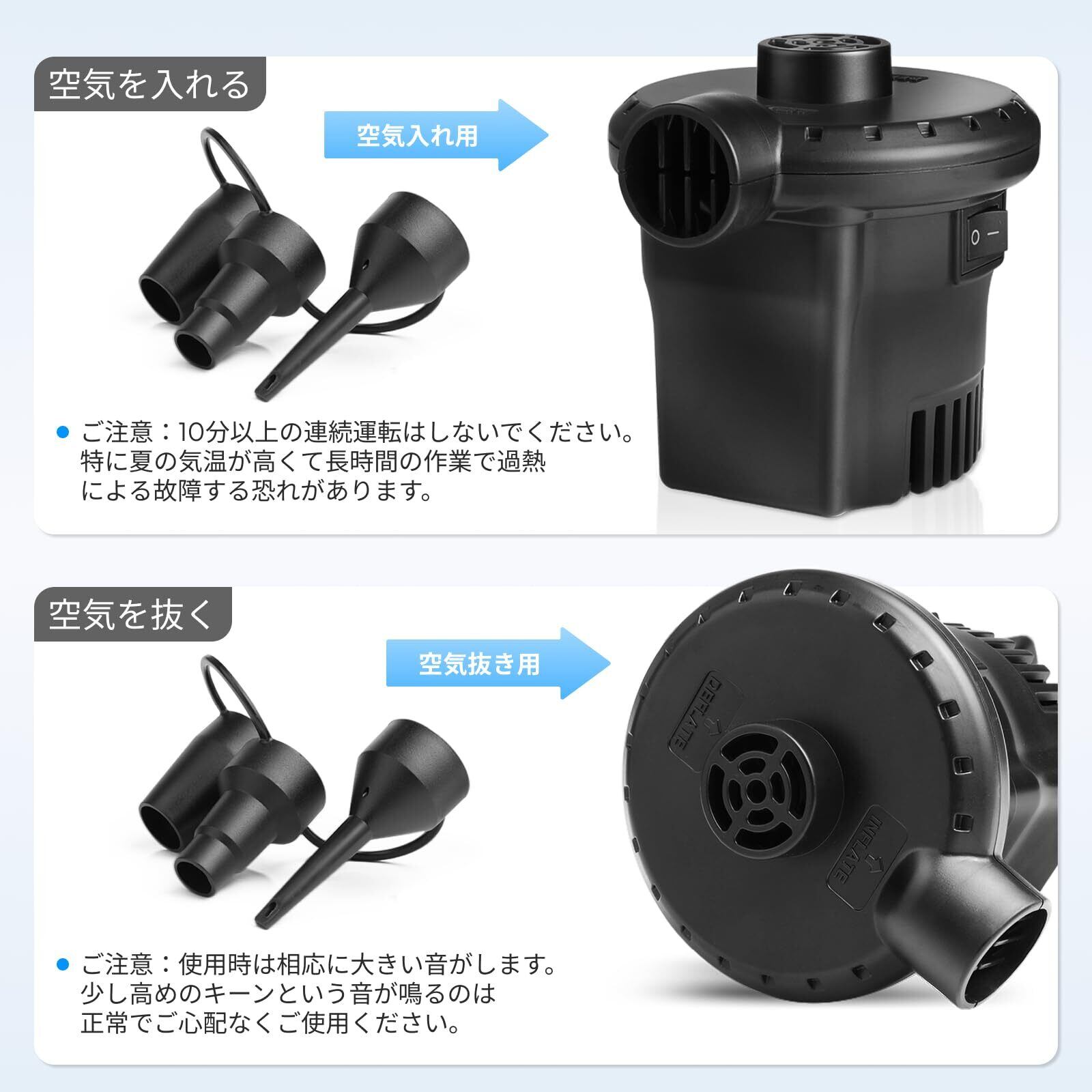 【給気&排気両対応】空気を入れる・空気を抜くってこの一台で両対応でき、2通りの使い方ができます。保護機能付き、本機の温度が高温になるとモータが自動停止します。これは保護機能によるものであり故障ではありません。本機を冷ましてからご利用ください。 ※ご注意:10分以上の連続運転はしないでください。特に夏の気温が高くて、長時間の作業で過熱による故障する恐れがあります。