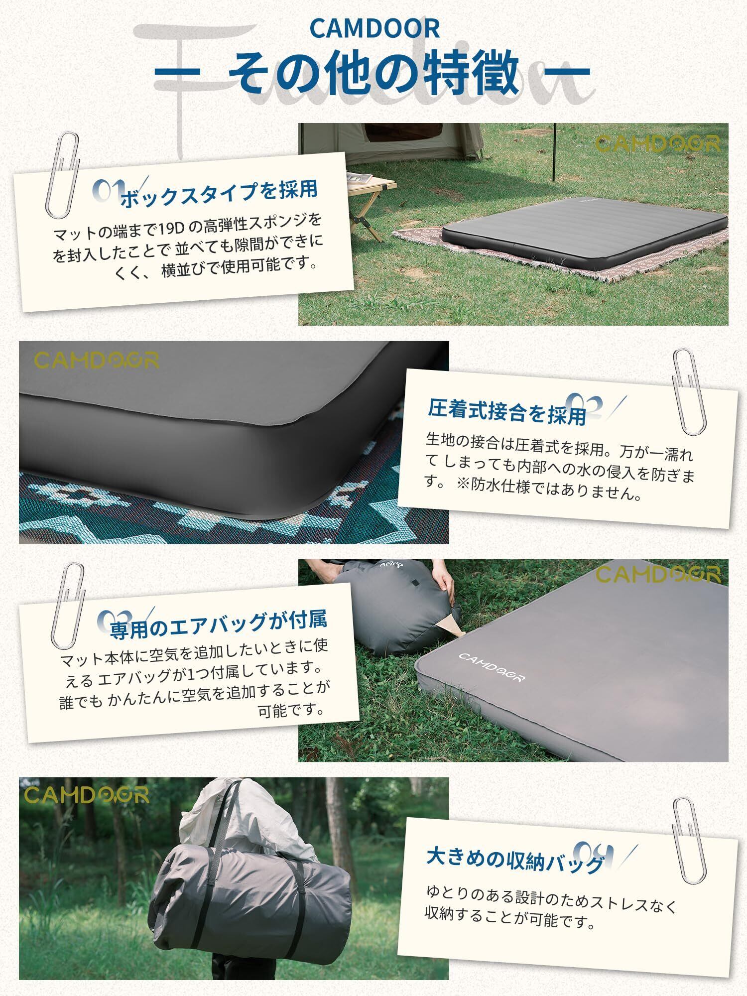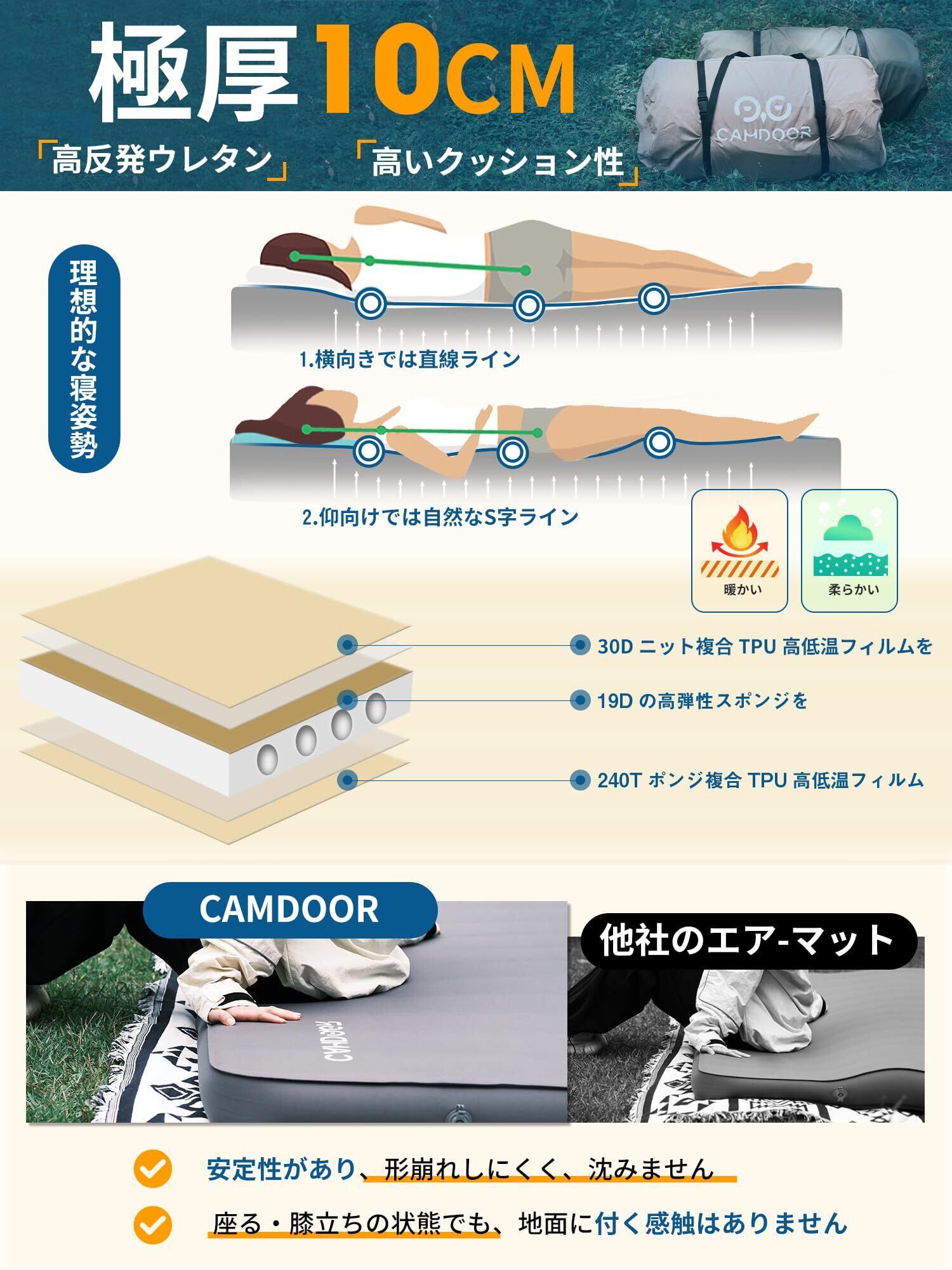 CAMDOOR キャンプ マット エアーマット ダブル 厚手 10cm 【90秒自動膨張・ソフトな手触り】インフレーターマット 自動膨張 キャンパー 車中泊 キャンプ用品 防水防潮 防災 安全無臭 四季使用可能 インフレータブルバッグと収納バッグ付属 持ち運び便利 簡単収納