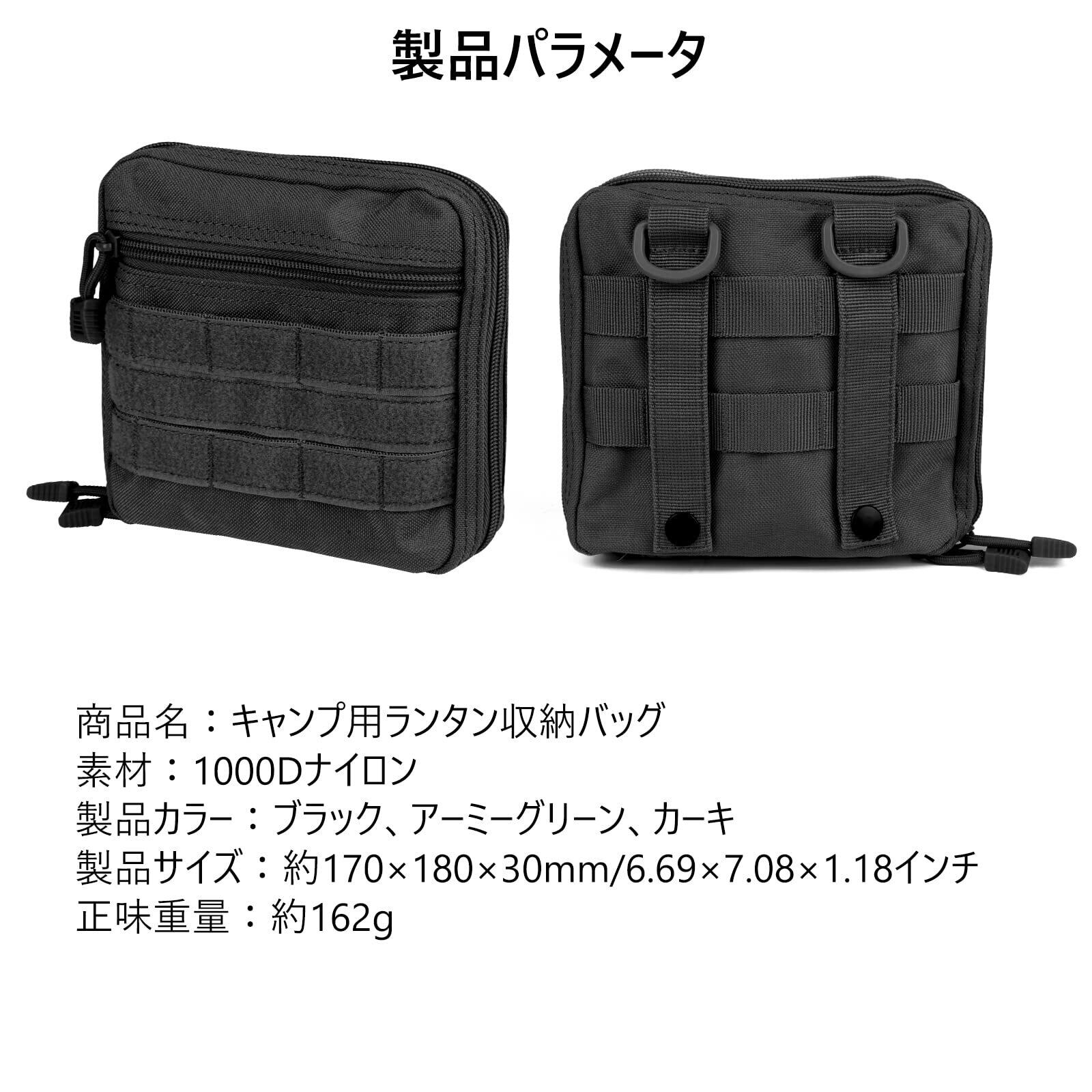 【LEDランタン収納バッグ仕様】:色:ブラック/ミリタリーグリーン/カーキ、製品素材:ナイロン、製品のサイズ:170x180x30mm、製品重量:約162g。工場は厳重に管理されており、美しく耐久性が優れ、軽量で持ち運びが簡単です。