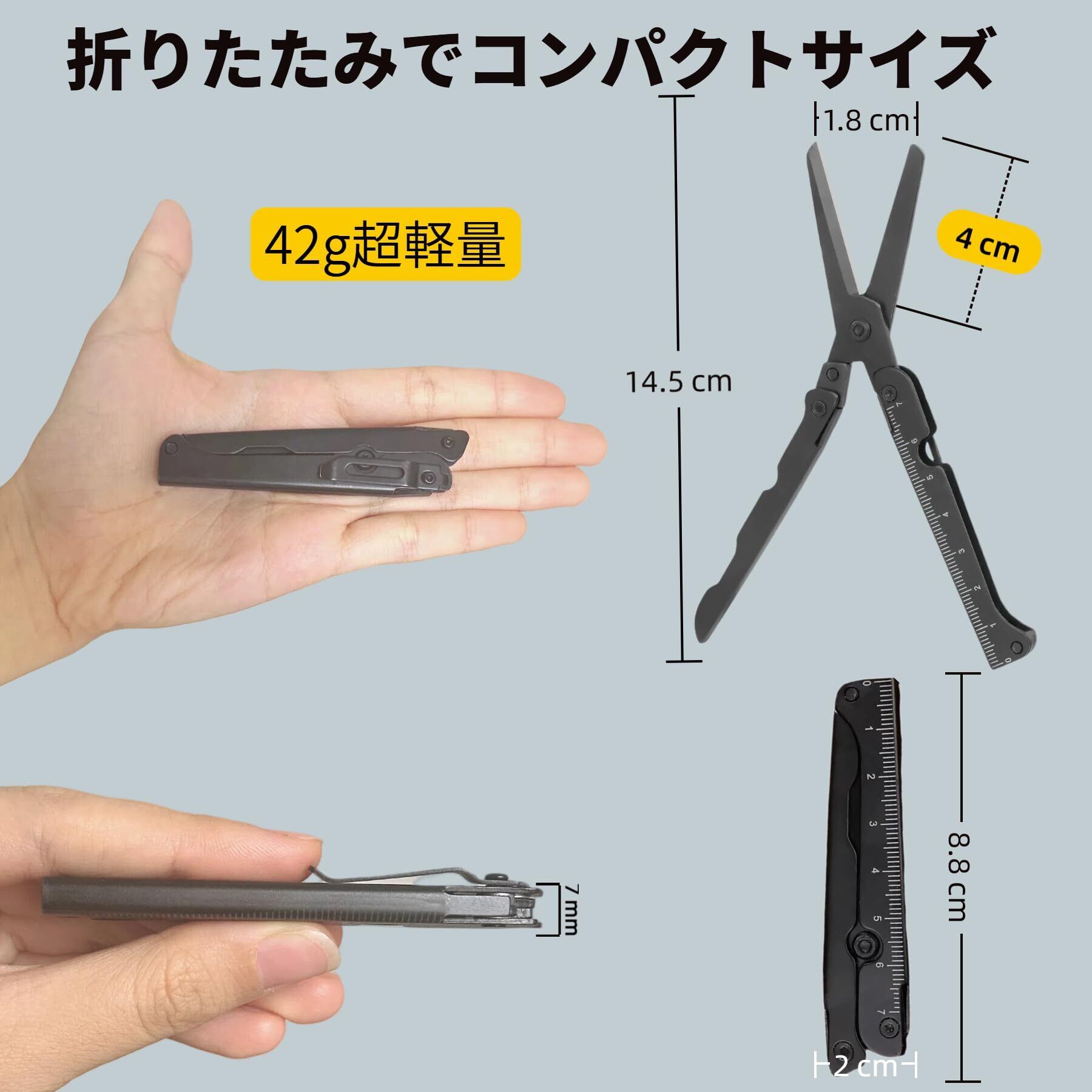 【アウトドアからオフィスまで幅広い用途】重量 42g の軽量デザインで持ち運びが容易で、野営、旅行、外出などのアウトドアシーンはもちろん、オフィスや家庭での日常的な使用にも適している。折りたたみ式のデザインと多機能性により、必要な時にいつでも手元に備えておける便利なツールである。