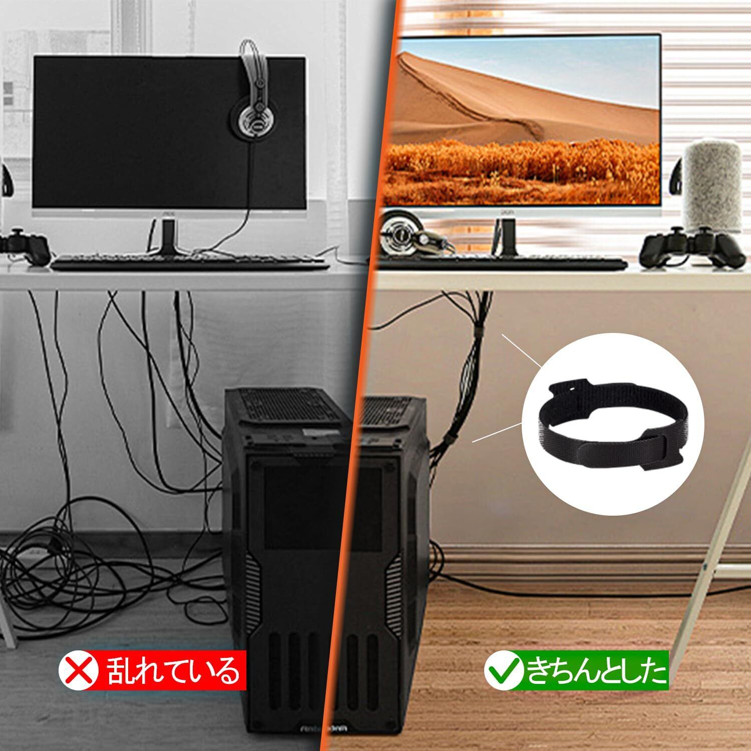 【簡単に使用】ケーブル結束バンド:ケーブルをまとめた後、 結束バンドの穴を通したら何回にケーブルの真ん中に回って貼ります。 長さが足りない時は、テープをつなげて利用するくことも出来ます.全体を束ねるときに簡単に結束できますできます。