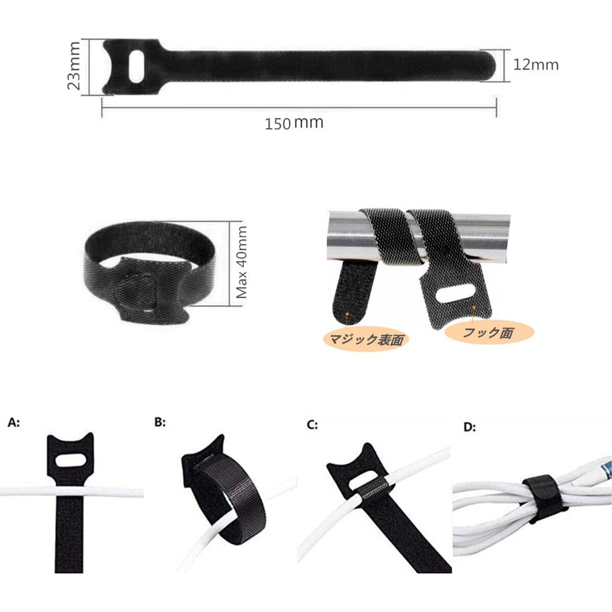 【バンド仕様】ブラック 50本セット ;サイズ:12*150 mm /本。表面:全面フック面. 裏面:全面ループ面。50ピースのバックルを接続すると、結束バンド の総長7.5mになります。