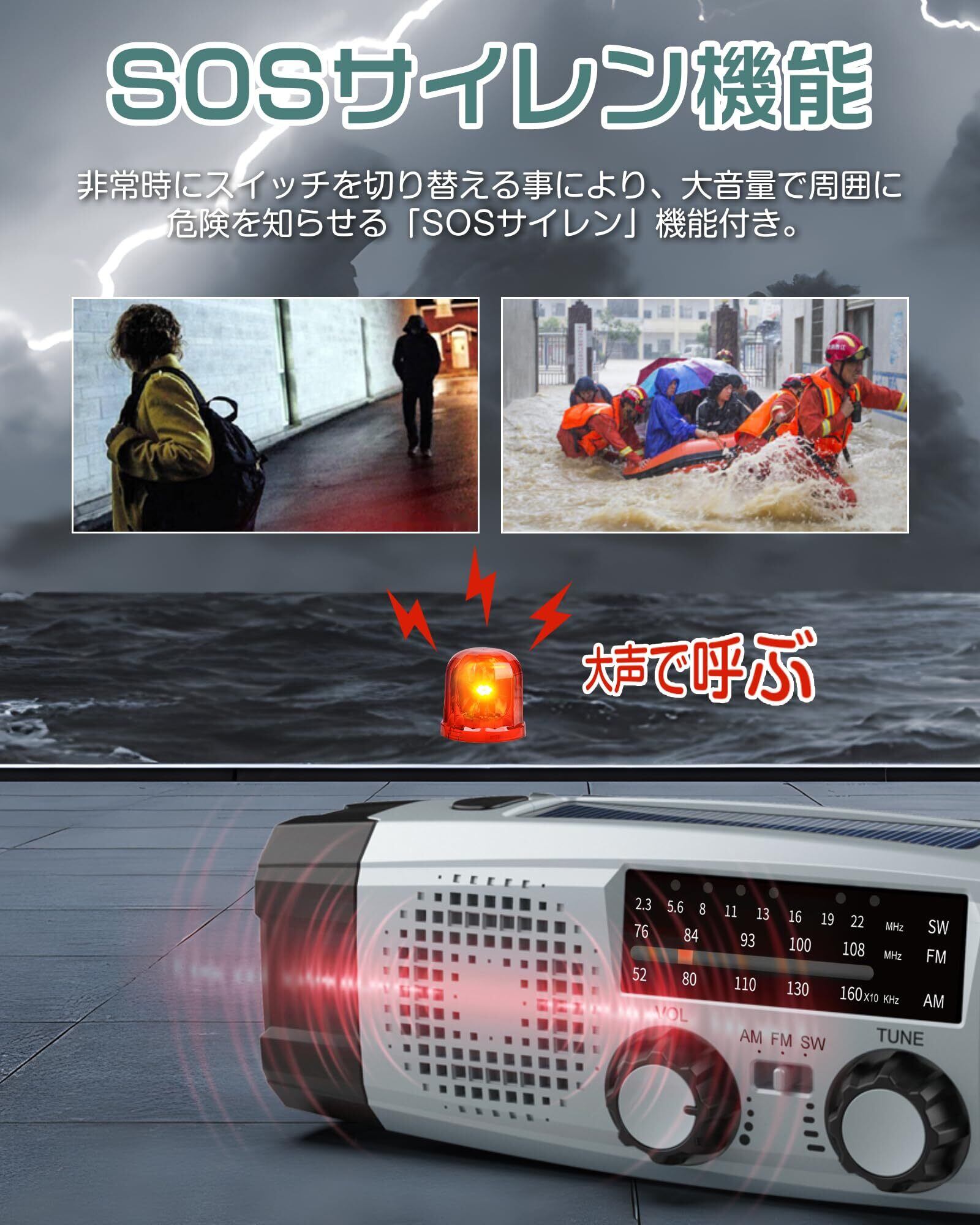 【SW/AM/FMラジオ高感度受信】防災ラジオ、大切な家族の為の災害時の備え!SW/AM/FMラジオ(SW:2.3~22MHz、AM:522~1710KHz、FM:76~108MHz)に合わせることが出来ます。災害時に一番大切なのは現状把握と情報確保ですので、ラジオ機能はかかせません。日常生活のラジオ鑑賞にも使用できるのでとても便利です。緊急時には、台風や地震、津波が発生しているときに、最近の重要な情報を受け取るために使用できます。また、伸縮アンテナを搭載しております、抜群な受信感度を実現できます。アンテナを伸ばしながら角度を調節する事により、電波をより受信しやくなります。