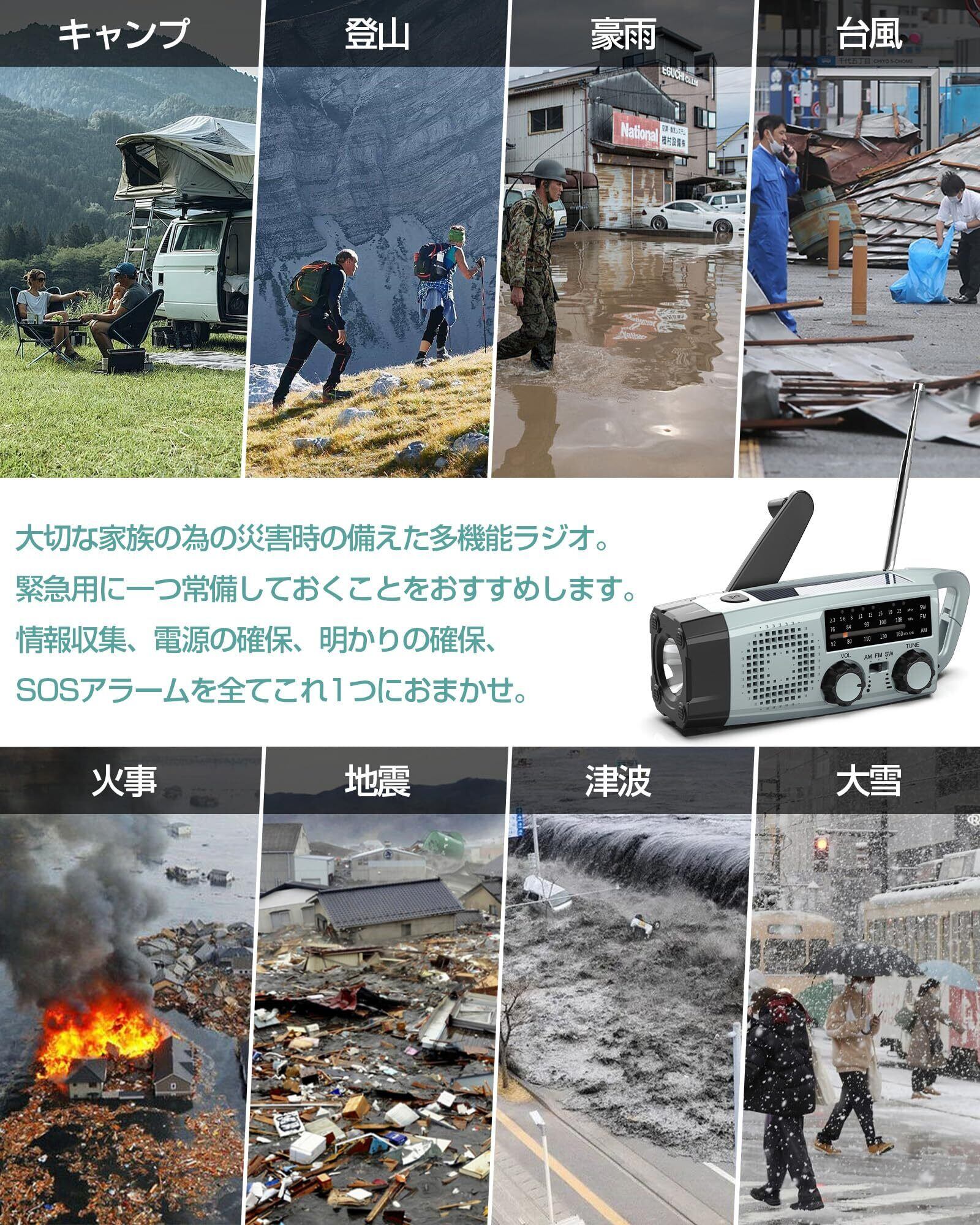 Greeshow 防災ラジオ 多機能 懐中電灯 SW/AM/FM 携帯ラジオ(FM周波数76.00Mhz - 108MHz) SOSアラート付き 台風 地震 津波 停電などの緊急対策 小型 2000mAhバッテリ 防水 防災用 アウトドア キャンプ 緊急用 USB充電式 非常用 ソーラー 手回し充電 スマホ充電可能 LEDライト PSE技術適合 日本語取扱説明書 GS-383
