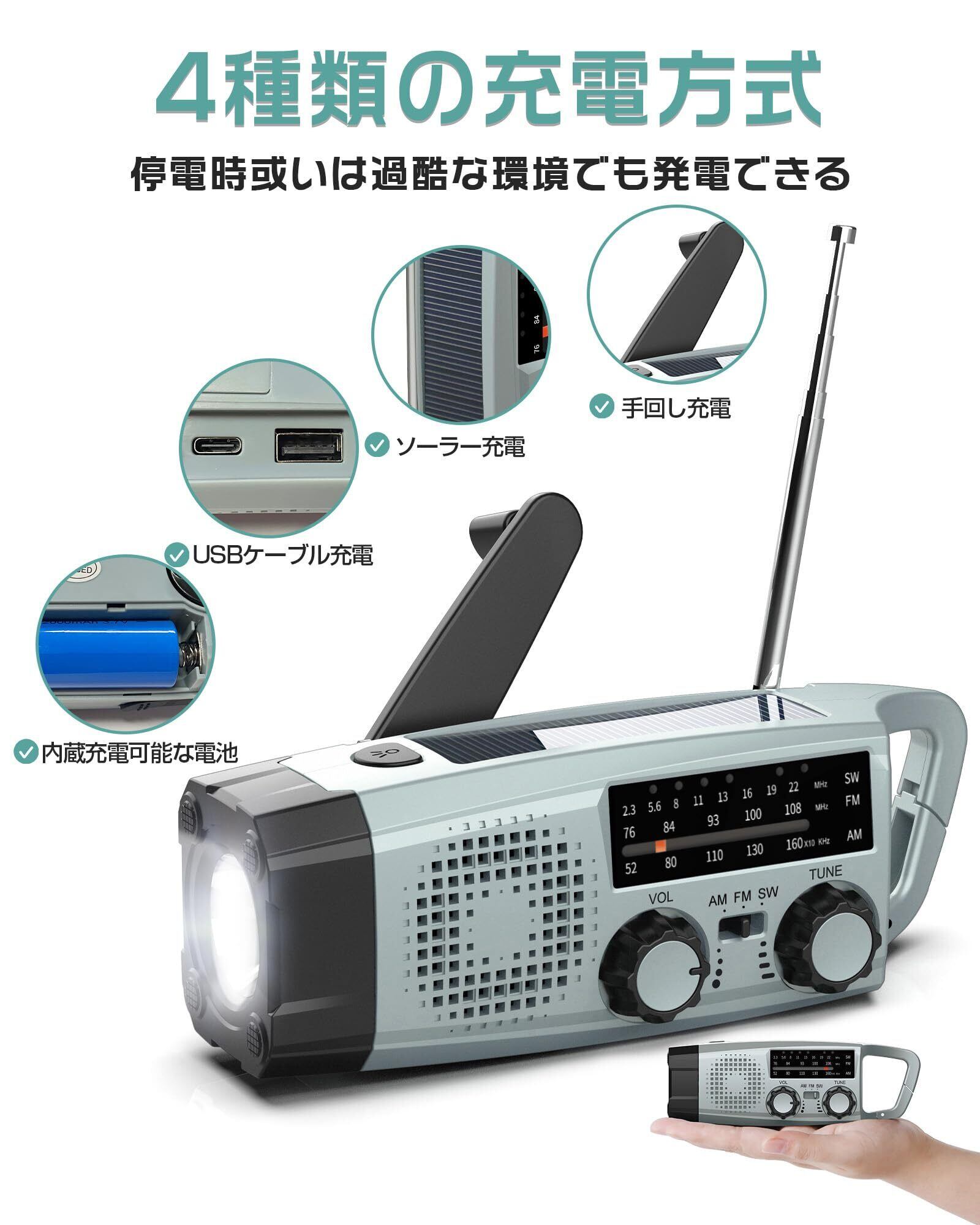【4WAY充電方式&2000mAhバッテリー&PSE認証取得】手回し充電、USB充電、ソーラー充電、内蔵充電池の4WAY充電方式を採用。日常用と防災用の両方に対応し、「使おうとしたら充電が無かった」という心配を防ぎます。ソーラー充電は太陽光の下に置くだけで充電可能。緊急時には手回し充電も可能です。2000mAhの大容量バッテリーを搭載し、スマホの充電も可能。満タン充電でラジオは13-15時間、懐中電灯は7-9時間使用できます。IPX3防水仕様。ただし、完全防水ではありませんので、水に浸さないでください。さらに、PSEマークも取得済みで、安心して安全にご使用いただけます。