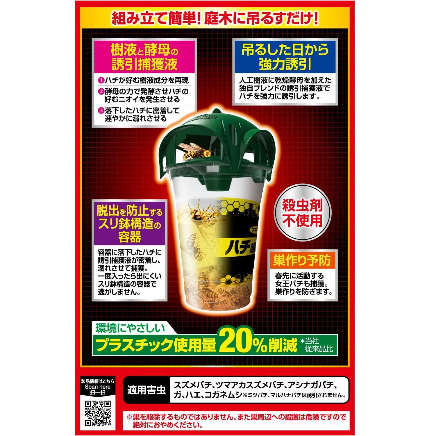 ●吊るした日から強力誘引 人工樹液に乾燥酵母を加えた独自ブレンドの誘引捕獲液でハチを強力に誘引します。 ●一度入ったら出られない 容器に落下したハチに誘引捕獲液が密着し、溺れさせて捕獲。一度入ったら出にくいスリ鉢構造の容器で逃がしません。 ●巣作り予防にも 春先に活動する女王バチを捕獲すれば、巣作りも防げます。 ●持続期間約1ヵ月 ●スズメバチを逃がさない ●容器形状を一新 新形状の屋根の採用により、組み立てが簡単になりました。さらにプラスチック使用量は約20%削減※、環境にも配慮しています。 ※当社従来品比 ●使い捨てタイプ