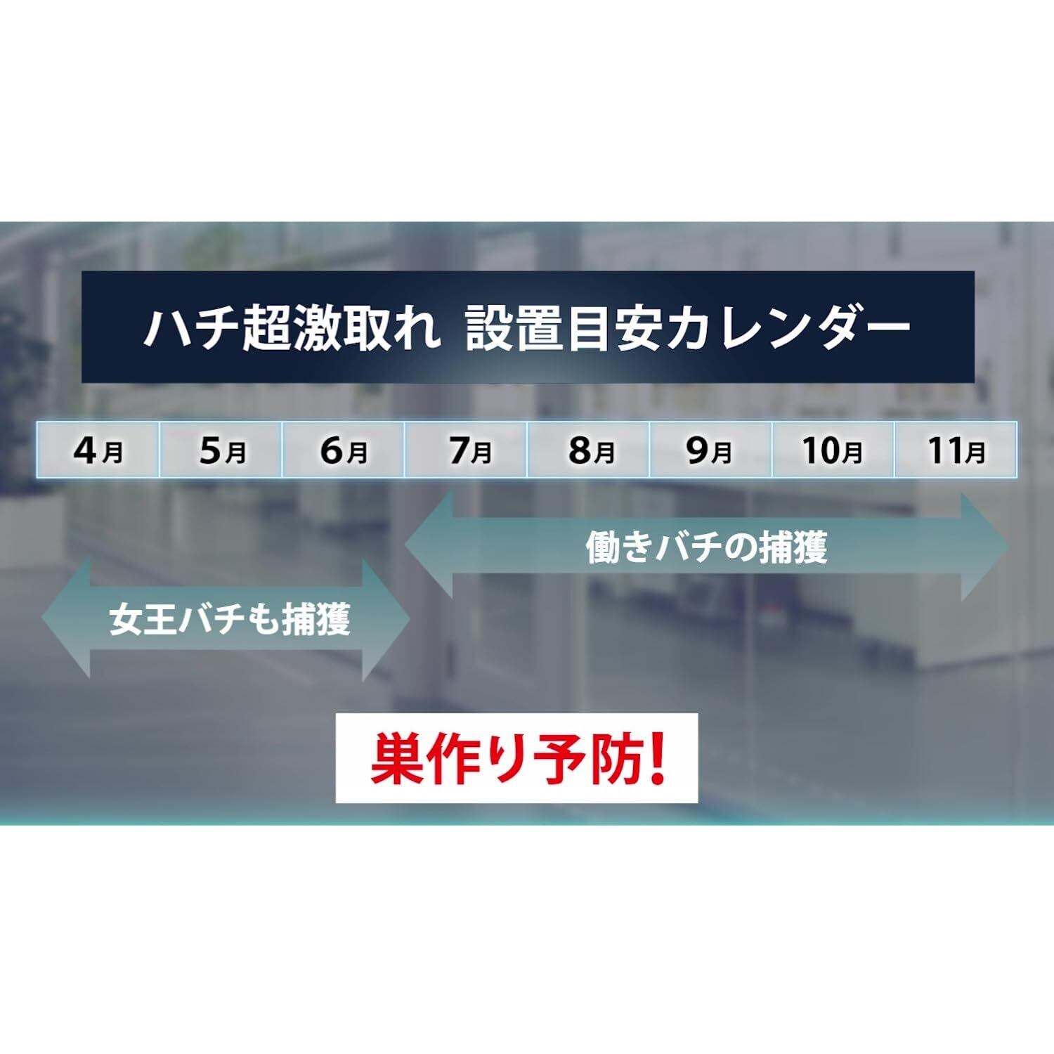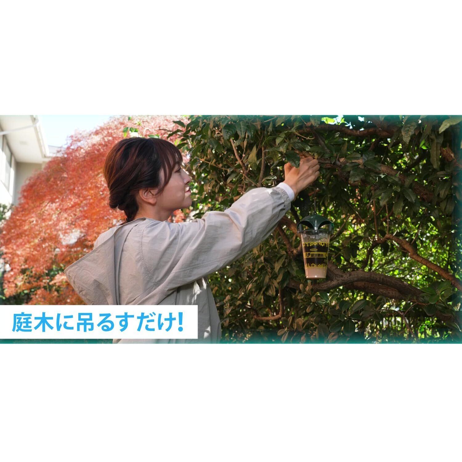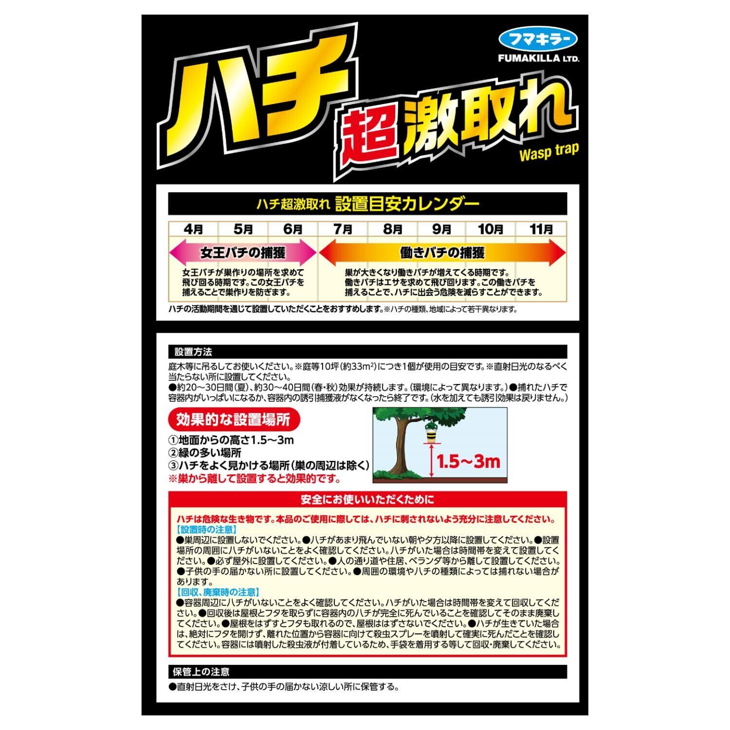 適用害虫:スズメバチ、ツマアカスズメバチ、アシナガバチ、ガ、ハエ、コガネムシ(ミツバチ、マルハナバチは誘引されません) 【組み立て方法は商品外箱をご確認ください】 ※誘引液をこぼさないよう注意してください。 【設置方法】 庭木等に吊るしてお使いください。 ※庭等10坪(約33㎡)につき1個が使用の目安です。 ※直射日光のなるべく当たらない所に設置してください。 ●約20~30日間(夏)、約30~40日間(春・秋)効果が持続します。(環境によって異なります。) ●捕れたハチで容器がいっぱいになるか、容器内の誘引液がなくなったら終了です。(水を加えても誘引効果は戻りません。) <効果的な設置場所> ①地面からの高さ1.5~3m ②緑の多い場所 ③ハチをよく見かける場所(巣周辺は除く) ※巣から離して設置すると効果的です 2-1.安全にお使いいただくために ハチは危険な生き物です。本品のご使用に際しては、ハチに刺されないよう充分に注意してください。 【設置時の注意】 ●巣周辺に設置しないでください。 ●ハチがあまり飛んでいない朝や夕方以降に設置してください。 ●設置場所の周囲にハチがいないことをよく確認してください。ハチがいた場合は時間帯を変えて設置してください。 ●必ず屋外に設置してください。 ●人の通り道や住居、ベランダ等から離して設置してください。 ●小児の手の届かない所に設置してください。 ●周囲の環境やハチの種類によっては取れない場合があります。 [回収、廃棄時の注意] ●容器周辺にハチがいないことをよく確認してください。ハチがいた場合は時間帯を変えて回収してください。 ●回収後はフタを開けずに容器内のハチが完全に死んでいることを確認してそのまま廃棄してください。 ●ハチがまだ生きている場合は、絶対にフタを開けず、中に殺虫剤をスプレーする等して確実に死んだことを確認してから廃棄してください。