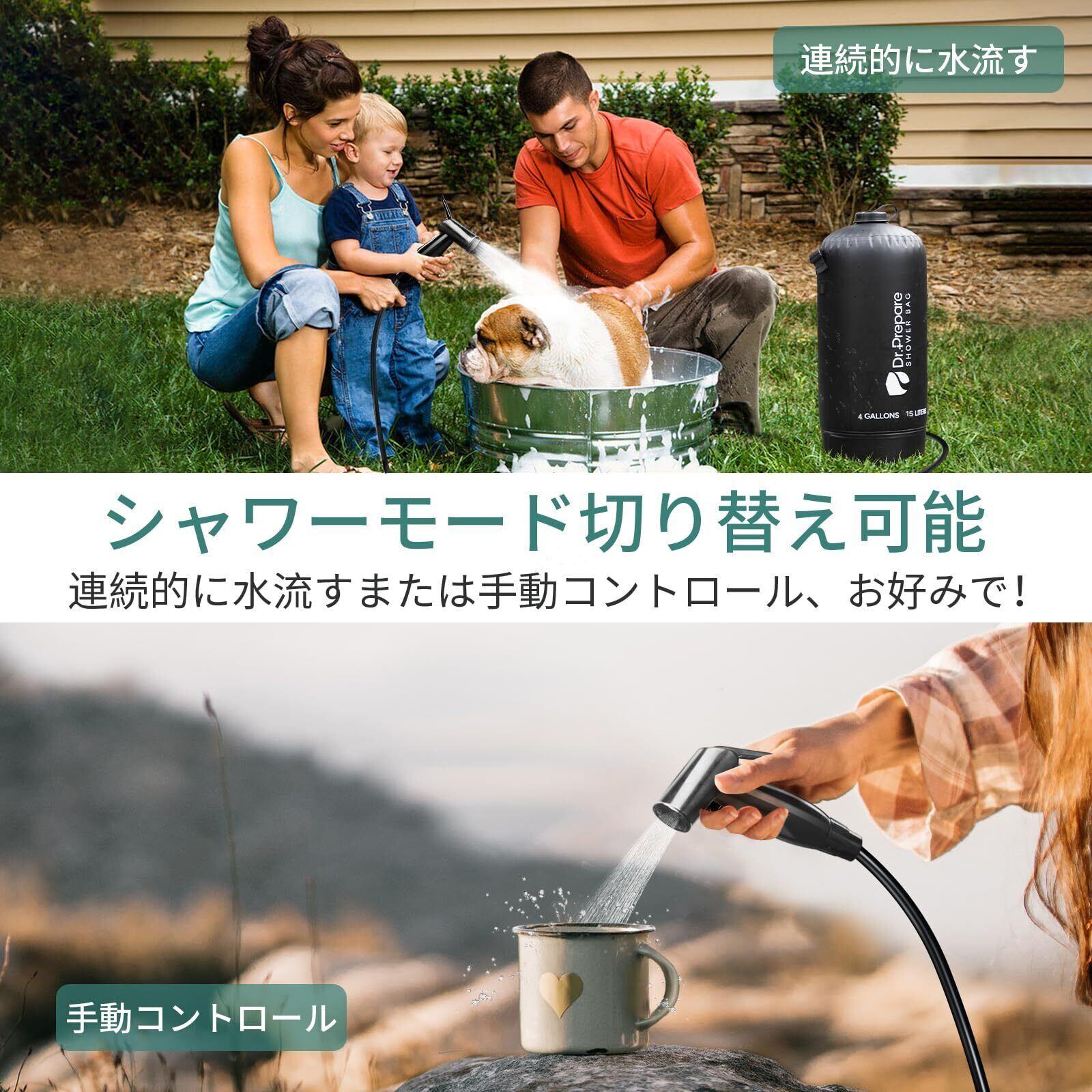 DR.PREPAREポータブルシャワー 簡易シャワー アウトドア シャワー 手動 加圧式 キャンプ 海 ポンプ ソーラー加熱 防災 15Lタンク ブラック