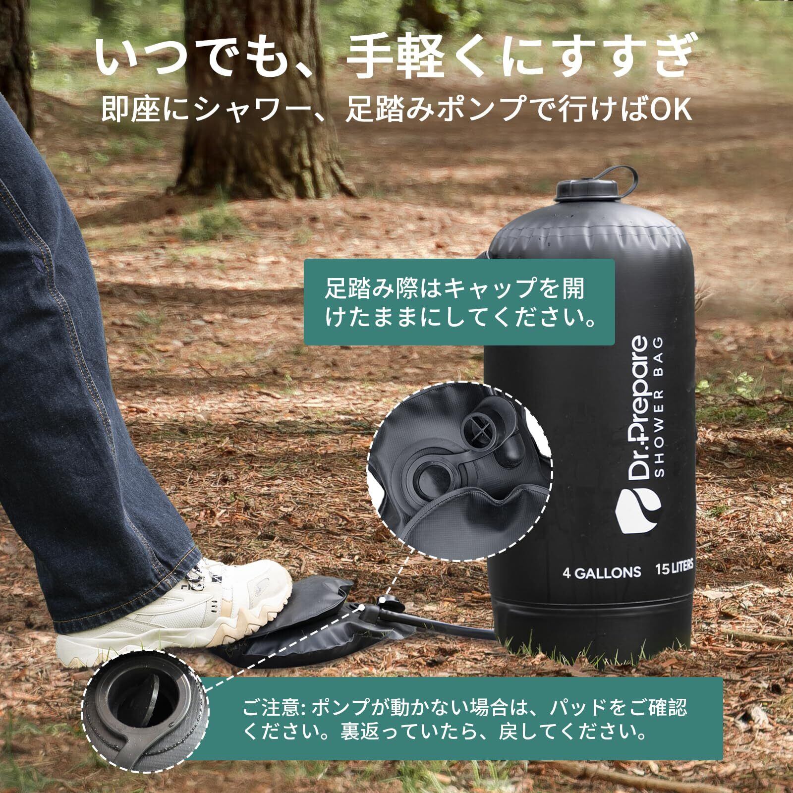 「使いやすいポータブルシャワー」Dr.Prepareアウトドア シャワーは簡単に使用できます。水を準備し、ポンプを連続して踏むことで必要な圧力をかけ、自分のペースで水流をコントロールできます。レバーを上に上げると水流が一定になり、下に下げると手動で水流を調整できます。